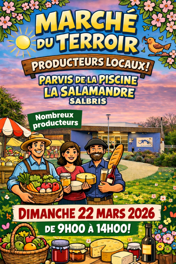 La Piscine La Salamandre organise un Marché du Terroir – Producteurs locaux le dimanche 22 mars 2026, de 9h00 à 14h00, sur le parvis de la piscine La Salamandre.